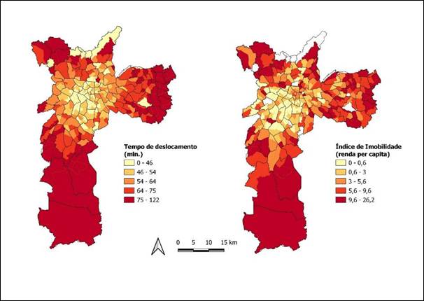Santos (2002) interpreta essa dinâmica como expressão do “globalitarismo”, conceito que combina globalização e totalitarismo – neste caso, do dinheiro e da ideologia –, operando por meio da seletividade no uso do território e produzindo zonas luminosas, beneficiadas pelo capital, e zonas opacas, nas quais a população é deixada à margem. Na cidade marcada pela urbanização corporativa, os espaços são fragmentados a partir da imobilidade relativa dos mais pobres nas periferias, que vivem praticamente exilados no lugar devido à baixa renda, pobreza, desemprego e “bicos”, no circuito inferior da economia. Quando se deslocam, é sobretudo para garantir a reprodução do capital, gastando muito tempo com os precários transportes coletivos, na condição de homens e mulheres lentos. Não por acaso, é nas periferias urbanas de São Paulo que se concentram a lentidão e a imobilidade, em particular, na periferia da Zona Leste, que representou 26% dos maiores tempos de deslocamentos e 76% dos maiores índices de imobilidade em relação à média da cidade de São Paulo (figura 8).