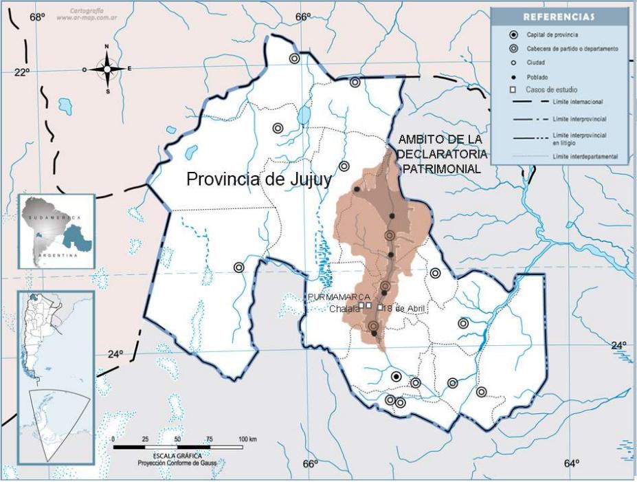La Quebrada de Humahuaca, ubicada en la provincia de Jujuy al norte de la Republica Argentina, en el año 2003, fue declarada Paisaje Cultural, Patrimonio Mundial, por la UNESCO (figura 1). Ha sido valorada por ser un ejemplo de los valles surandinos y por poseer huellas de más de 10.000 años de ocupación humana. Conserva vestigios de su pasado, con centenares de sitios arqueológicos e históricos, en un entorno natural también excepcional. Su población actual mantiene costumbres tradicionales, algunas de raíces ancestrales. Habitan allí quebradeños y pueblos originarios que tienen creencias religiosas, ritos, fiestas, música y técnicas artesanales y agrícolas que son consideradas patrimonio, entre otros aspectos que también han sido valorados como parte del Paisaje Cultural. A partir de ese reconocimiento, junto con las políticas públicas de promoción del turismo nacionales y de la provincia, entre otros cambios, la Quebrada de Humahuaca atravesó nuevos procesos de patrimonialización y turistificación que produjeron transformaciones territoriales, procesos de territorialización y conflictos sociales, algunos nuevos, otros preexistentes. De este modo, el objetivo de este trabajo es identificar las transformaciones territoriales y los conflictos que surgen vinculados a estos procesos. Para ello, propusimos cruzar la mirada de los estudios académicos, de los técnicos y de las planificaciones territoriales con una metodología participativa específica: el mapeo participativo de los conflictos socioterritoriales.