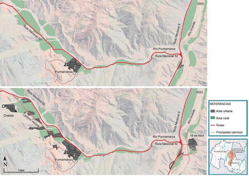En el caso de Purmamarca, en particular, los nuevos barrios de Chalala y 18 de Abril, ubicados a cerca de 3 km del casco histórico de Purmamarca, hacia el oeste y hacia el este, se formaron con la organización de comunidades indígenas (Mancini & Tommei, 2022). Asimismo, se dio una importante expansión en el territorio, en continuidad con la trama del casco urbano (figura 3), y se mejoraron los caminos internos (se corrió la ruta internacional y se convirtió en camino vecinal un tramo de la ruta, a fin de que sea de uso cotidiano para la población y los hoteles que se establecieron al costado de esta).