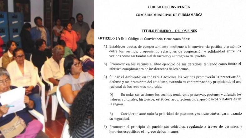 Luego, destacamos un proceso propio de la comunidad purmamarqueña. Durante el año 2017, a raíz de algunos conflictos por vecinos que intentaban cercar y “privatizar” algunos accesos centrales para el pueblo (como el paseo de los colorados), o de proyectos de peatonalizar el casco de Purmamarca, el comisionado municipal propuso reuniones de debate para generar un Código de Convivencia[iii]. Después de algunas jornadas de trabajo, se presentó un primer código discutido comunitariamente (figura 4). Allí, se señalan las principales preocupaciones de purmarqueños y purmamarqueñas. El texto del código de convivencia resultante tenía como fin establecer pautas de comportamiento para la coexistencia armónica entre los vecinos, promover un pueblo sin vehículos, un uso correcto de los espacios públicos, el cuidado del ambiente, y una participación activa de la comunidad en la toma de decisiones. Como uno de los principales fines del código, se acuerda el cuidado del ambiente y todas las acciones necesarias para “preservar, proteger y difundir los valores culturales, históricos, estéticos, arquitectónicos, arqueológicos y naturales de la región” (Código de Convivencia, Art. 1, d). El código aborda los conflictos en esa conviviencia entre vecinos, por lo tanto es información sobre los conflictos socioterritoriales de Purmamarca. En este se busca regular: el uso de la vía pública; sobre daños, cambios o trabajos y los permisos o habilitaciones necesarios; sobre los comercios, la inclusión en la venta de artesanías “auténticas”, habilitaciones y el uso de la vía píblica; venta ambulante; higiene del espacio público. Sobre el ambiente, las preocupaciones son sobre los ruidos excesivos, como definirlos, establecer horarios, responsabilidades y establece multas; del impacto ambiental, tiene el objetivo de preservar, conservar, defender y mejorar el ambiente, se busca evitar la degradación y conservar “el paisaje natural, los sitios, lugares, monumentos y obras de interés arquitectónico, arqueológico y todo aquello que integre el patrimonio natural y cultural del Municipio” (Código de Convivencia, Art. 17).