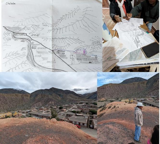 En el transcurso de 2021 a 2024 realizamos entrevistas a los comuneros de Coquena y Chalala, así como un taller participativo en ambas comunidades en 2022. Este trabajo fue el necesario para poder proyectar el mapeo participativo (figura 6). A partir del mismo, y de investigaciones previas en la región, se pudo reconstruir la historia de las transformaciones de los barrios que conformaron ambas comunidades a lo largo del tiempo, por ejemplo en Mancini e Tommei (2022). Además, se contó con acceso a documentación que cedían las comunidades. Entre ella, el estatuto de las comunidades, fotografías personales, actas de reuniones, entre otras.
