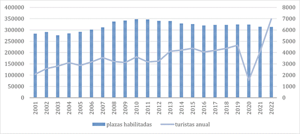 San Martín de los Andes es el destino turístico más importante de la provincia de Neuquén. En el periodo de 2001-2022, la cantidad de turistas que se alojaron en la ciudad presentó una tendencia al alza, exceptuando la abrupta caída durante la pandemia de COVID-19 (figura 5), aunque ésta fue seguida de una suba significativa, alcanzado un máximo de casi 350 mil turistas en 2022 (Ministerio de Turismo de la Provincia de Nuequén, 2024). Los niveles más altos de factor de ocupación se registran en la temporada estival, en los meses de enero y febrero (con picos por encima del 70%), seguidos por los meses de julio y agosto, en la temporada invernal (con niveles algo menores, pero que de igual manera alcanzan máximos cercanos al 60%) (MSMA, 2022). La mayor parte de los turistas que recibe la ciudad son de origen nacional, mientras que aproximadamente un tercio son extranjeros, principalmente de Brasil y de Chile; además, el público ha sido tradicionalmente familiar, lo que explica la existencia de un porcentaje importante de alojamientos tipo apart y cabañas (comunicación personal con funcionario de la Secretaría de Turismo, 19 de mayo de 2022).