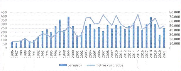 Al poner en relación la cantidad de permisos de construcción otorgados y su superficie, se observa que, aunque hay incrementos periódicos de la cantidad de permisos (incluyendo nuevas construcciones y ampliaciones), aumenta más significativamente la superficie edificada (figura 6). Por un lado, en Argentina, la crisis de 2001 motivó la desconfianza en el sistema financiero movilizando activos hacia otros destinos, especialmente el ladrillo como forma de resguardo de valor (Del Río, Langard, Arturi & Politis, 2013, p. 84). Por otro, este fenómeno de escala nacional se correspondió localmente con la llegada de una oleada de migrantes motivados por la huida frente a la incertidumbre económica y la inseguridad en las grandes ciudades que vieron en San Martín de los Andes una oportunidad de mejorar su calidad de vida e invertir (Nakayama & Marioni, 2007). Se produce una estructura urbana dispersa, que es percibida como un problema creciente para el gobierno municipal. Por un lado, “se pasa de un consumo de suelo de 262 m2 por habitante en 1991 a 582 m2 por habitante en 2010” (Giglio, 2017, p. 46); por otro, las ubicaciones y la distancia entre los proyectos inmobiliarios, muchos de ellos enmarcados en áreas de montaña o en costas de lagos o ríos, implican desafíos para la provisión de servicios como gas o agua potable, además de los impactos ambientales que pueden traer aparejados. Esto no es exclusivo de los barrios autoproducidos o producidos a través de planes estatales, sin embargo, los sectores con mayor solvencia pueden costear el acceso a través de estrategias particulares o privadas.