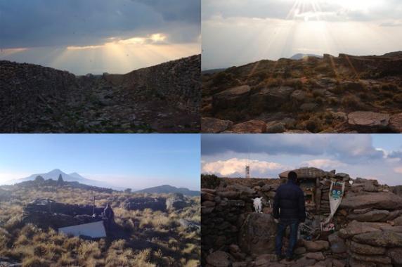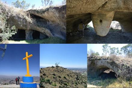Hacia el poniente, en la cima del cerro San Joaquín Cuauhyacac, a unos cuantos metros y frente al complejo de cuevas, encontramos un montículo con una plataforma circular donde actualmente se encuentra una cruz como símbolo religioso en donde actualmente se pide lluvia cada año (figuras 11 y 12). Respecto a la estructura circular, Parsons (1971) indica que fue un “recinto ceremonial” del período formativo preclásico tardío -400 a.C a 200 d.C- y Palerm & Wolf lo describen como un “centro ceremonial”, el cual “sugiere la conexión del lugar con el culto al dios Quetzalcóatl” por su forma circular (Palerm & Wolf, 1980).
