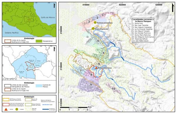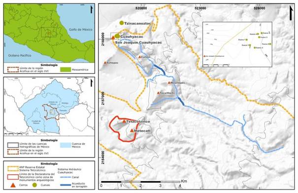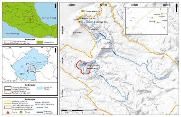 Tanto Rodríguez (2021) como Coronel (2023) han ubicado varios huey tecpan (bosques, palacios y jardines) en la región Acolhuacan y es de llamar la atención dos bosques de recreación o jardines, ya que su arquitectura está construida y modelada en cuevas: Cuauhyacac y Tzinacanoztoc (este último acutalmente colapsado pero de igual importancia histórica que el primero). Ambos sitios se encuentran muy cerca uno del otro, en la misma elevación. Todos los demás jardines o bosques o palacios están construidos con mampostería. De todos los huey tecpan ubicados, destacan dos que aquí abordaremos: Cuauhyacac y Tetzctotzinco, su importancia es porque ambos cuentan con una infraestructura hidráulica muy similar, están emplazados sobre elevaciones menores, aún se puede reconocer su estructura y narrativa arquitectónica con la cual realizaremos este estudio crítico y, además, hoy en día están dentro de la Reserva Estatal “Sistema Tetzcotzinco” (Secretaría de Medio Ambiente del Gobierno del Estado de México, 2001), zona de protección ambiental (figura 2). Pero hay una diferencia en su arquitectura, el primero es arquitectura adaptativa y el segundo es arquitectura de mampostería.