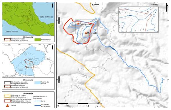 iban de los casi 250 metros hasta 450 metros de largo (Parsons, 1971). Por encima de estos terraplenes colaron un conglomerado de un solo bloque para lograr obtener un canal de una sola pieza (figura 6). El canal de cada terraplén seguía corriendo por los interfluvios hasta llegar a la sierra Tlaixpan. En el caso del Tetzcotzinco desembocaba en dos cimas en las cuales se bifurcó el canal rodeando ambas formas del relieve, actualmente una elevación es llamada Metecatl y la otra desconocemos su nombre y, en el caso del Cuauhyacac, rodeaba una sección amplia de la Sierra Tlaixpan (figura 5).