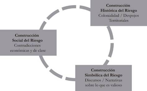 Sin embargo, este modelo, relativamente útil para explicar las afectaciones humanas, no nos satisface para explicar la complejidad de la conservación material de las obras humanas en el pasado. Por ello, proponemos aquí una variante en desarrollo desde una perspectiva que se pretende más amplia, incluyendo el factor del tiempo, fundamental para entender nuestro objeto de estudio, así como la condición valorativa que se le asigna. Se propone una tríada de perspectivas que entran en juego para analizar el riesgo de desastre en los monumentos. Partimos de la noción mencionada sobre la Construcción Social del Riesgo, analizada por ejemplo por García-Acosta (2005, p. 16) en los términos de su relación con la vulnerabilidad. La misma García-Acosta (2005, p. 19) plantea la necesidad de entender los riesgos como un proceso, por la tanto, en una dimensión histórica, de larga duración. En ese sentido, integramos esto al esquema planteado (figura 14), sin embargo, con una particularidad para el contexto mexicano y latinoamericano, que corresponde a la historia colonial y de despojo originario de los territorios de comunidades y naciones por parte del poder occidental europeo y las élites económico - políticas al interior de nuestros países. Esta revisión histórica proponemos nombrarla como Construcción Histórica del Riesgo. El último componente en juego, no es por ello menor, pues en muchos sentidos fortalece y se fortalece de las anteriores, la Construcción Simbólica del Riesgo, que se refiere al conjunto de discursos y narrativas que se construyen, desde la institucionalidad o desde las comunidades sobre los valores atribuidos a los bienes monumentales, lo que en última instancia influye directamente en su conservación y protección.