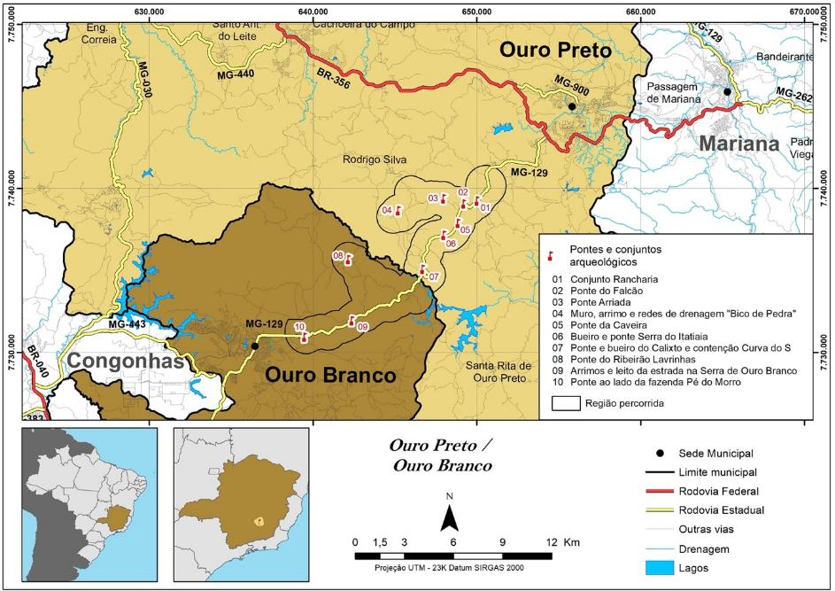 O trabalho contempla a estrada (e partes da atual rodovia MG-129) entre os municípios de Ouro Preto e Ouro Branco, Minas Gerais, pertencente à rede de caminhos conhecida popularmente por “Estrada Real”. Trata-se de um sítio arqueológico de expressiva importância patrimonial para a compreensão da ocupação e espacialização regional e, por extensão, para o turismo.
