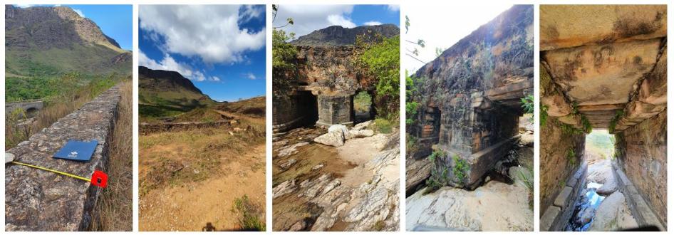 Apontamos no mapa apresentado anteriormente (figura 1) a localização do patrimônio edificado, fundamentalmente as pontes, mas, também, os bueiros, muros de contenção (arrimos), galerias pluviais e extensões empedradas do antigo caminho e, posteriormente, fazemos uma breve descrição. Em relação às edificações efetivadas para a transposição dos talvegues, identificamos dois tipos: as pontes e os bueiros (figura 2).