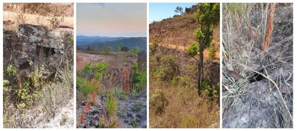 Para além das pontes e bueiros, tanto no eixo Bico de Pedra – Fundão, quanto no de Itatiaia, registramos alguns dos muros de contenção (arrimos), das redes de drenagem e dos leitos empedrados, os quais compõem a paisagem natural caracterizada pelos “mares de morros” (Ab’Sáber, 2003, p. 49), com afloramentos de quartzitos e uma rede hidrográfica encachoeirada, além da flora característica de transposição entre mata atlântica e cerrado (figuras 6 e 7).