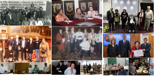 Notas: A [Encuentro Internacional “Lugar, formación socioespacial, mundo”, Auditório del Departamento de Geografía de la USP. De pie y adelante, desde la izquierda, son Maria Adélia de Souza y Milton Santos, acompañados de sus estudiantes de posgrado y, a la derecha, Amalia Inés Geraiges de Lemos y Francisco Capuano Scarlato, São Paulo, 1992]. B [2º Seminario Internacional sobre Comercio, Consumo y Ciudad, Universidad de Barcelona, España, a partir de la izquierda son Lluis Frago, Luis Rigol, Carles Carreras, Sergio Moreno, Jeferson Rezende, Amalia Inés Lemos, Everaldo Costa, Aurora García Ballesteros, diciembre de 2009]. C [Defensa de la maestría de Ricardo Barbosa, en la FFLCH/USP, 2009, con el jurado constituido por Amalia Inés Geraiges de Lemos (tutora), Mónica Arroyo y William Ferreira]. D [EGAL/2013, Lima, Universidad Nacional Mayor de San Marcos, mesa redonda con Georgina Calderón, Amalia Inés Geraiges de Lemos y Mónica Arroyo]. E [Otorga del título de Doctor Honoris Causa de la Universidad de Barcelona, España, a Milton Santos, con la presencia de Amalia Inés Geraiges de Lemos, Horacio Capel, Joan Eugeni Sánchez, Marie-Hélène Tiercelin, Adir Balestreri Rodrigues y Mercedes Marín]. F [EGAL/2009, Uruguay, Amalia Inés Lemos y Sandra Lencioni asistiendo a una sesión temática]. G [Participación en el homenaje realizado por la Municipalidad de São Paulo a Francisco Capuano Scarlato, con la participación de Amalia Inés Lemos, Jurandir Ross, Sueli Furlan y Marisia Buitonni]. H [Otorga del título de Profesora Emérita de la USP a Amalia Inés Lemos, por iniciativa del Programa de Integración de América Latina/PROLAMUSP]. I [Otorga del título de Doctora Honoris Causa de la Universidad Nacional de Cuyo, Argentina, 2022]. J [Jornada de los 30 años de cooperación entre el Departamento de Geografía de la USP y el Instituto de Geografía de la UBA, Amalia Inés Lemos, Mónica Arroyo, Pablo Ciccolella, y otros docentes, Buenos Aires, 2022]. K [Convivencia durante el EGAL/2019, Quito, Amalia Inés Lemos con Fabio Contel, Maria Laura Silveira, Mónica Arroyo, Fernanda Padovesi y otras colegas].