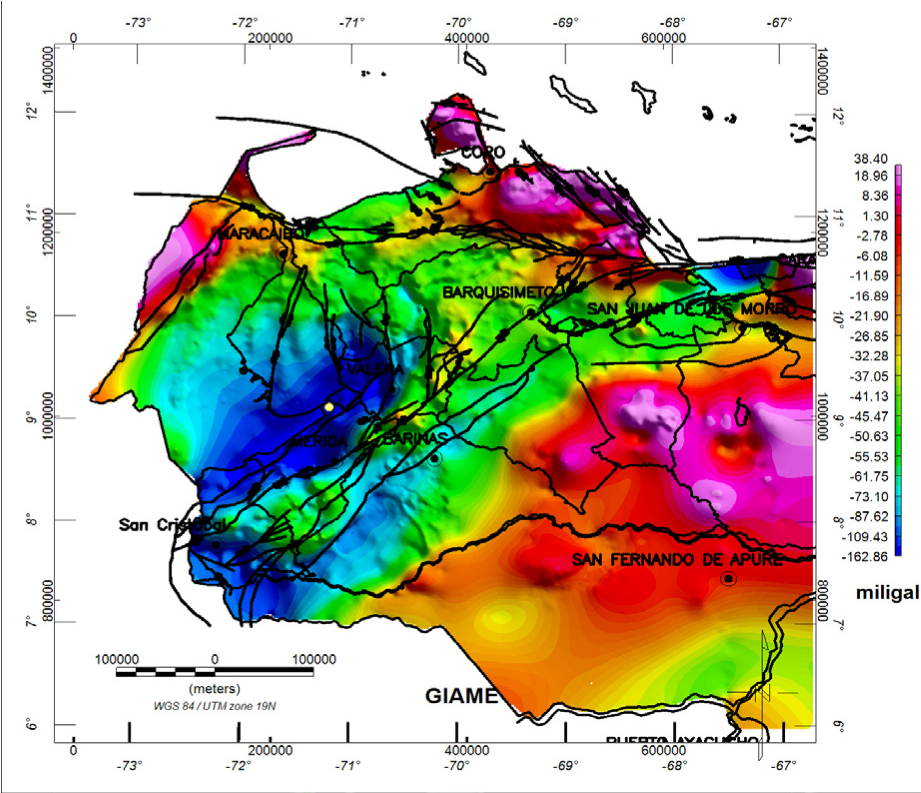 El Mapa de la Anomalía de Bouguer refleja los contrastes laterales de densidad asociado a estructuras geológicas presentes en el subsuelo las cuales son interés en este estudio. En la figura 9, tenemos una escala que va desde -162.86 (color azul) a 38.40 (color fucsia) mGal. Del mapa destaca el gran mínimo en color azul (valores entre –162.86 a -26 mGal) con rumbo en dirección SO-NE asociados a la cuenca del Lago de Maracaibo, el cual se encuentra paralelo y desplazado en dirección NO del rumbo de la cordillera de los Andes de Mérida, el desplazamiento es de aproximadamente 50 km. El punto en color amarillo representa el valor más negativo de -162.86 ubicado a 7 km al oeste de la población de Muyapa. El mínimo debería coincidir con la ubicación de la cadena montañosa, como es el caso común para sistemas orogénicos en equilibrio isostático. Este mínimo en un principio fue asociado a la gran acumulación de sedimentos en el sur de la cuenca del Lago de Maracaibo [9], pero luego de varios modelados gravimétricos realizados por diferentes autores (Kellogg y Bonini [9], Escobar y Rodríguez, [10] ) se concluye que esta acumulación de sedimentos no era suficiente para producirlo, sino que estaba relacionado con la configuración de diferentes estructuras de gran longitud de onda y a gran profundidad como lo son las placas suramericanas, la placa del Caribe (Audemard y Audemard [11], Colleta et al [12], Jacome [13]). El máximo, que va de -13 a 10 mGal con rumbo noreste el cual está ubicado sobre la topografía andina, tiene una longitud de aproximadamente 410 km desde la depresión del Táchira hasta ciudad de Barquisimeto y un ancho promedio de 60 km. Es de hacer notar el valle o ‘’silla de caballo’’ ubicado en la ciudad de Mérida que pareciera dividir la cadena montañosa en Andes suroeste y noreste, hacia la zona noreste se observa como la anomalía aumenta de -22 a -17 mGal asociada a los afloramientos cretácicos de las napas de Lara, en la zona suroeste la anomalía presenta una forma triangular con un rango entre -70 a -37 mGal. De la figura también podemos ver el mínimo (-110 a -100 mGal) al sur de la ciudad de San Cristóbal que está asociado a la depresión del Táchira donde el basamento se encuentra a 6 km de profundidad, aproximadamente [14]. Este mínimo cubre parte de la cuenca de Apure y continua hacia el sur de Barinas, aquí está asociado a la depresión de Capitanejo (-75 a -85 mGal) sobre la ciudad de Barinas se observa que la anomalía se hace menos negativa (–60 a -55 mGal) posiblemente asociado con el arco de Mérida. Al suroeste de la población de San Fernando de Apure, ubicado a -70° de longitud y 7° de latitud, tenemos un mínimo no tan prominente con valores de -12 a -18 mGal, el cual es una respuesta gravimétrica del graben de Mantecal,. Al noreste de la misma población se observan dos máximos entre 7 y 17 mGal vinculados al alto del Baúl. Al sur sureste de la ciudad de Coro se nota un alto (-10 a 30 mGal) con rumbo E-O el cual tiene una extensión aproximada de 200 km y un ancho promedio 60 km asociado al anticlinorio de Falcón. Este alto estaría mayormente influenciado por el acortamiento cortical en esta zona [16], con lo que la contribución de Mohorovic a la anomalía gravimétrica es más del 60 %, la expresión de la columna sedimentaria es minoritaria. De la figura, también se observa la asimetría entre las cuencas Barinas Apure y Lago de Maracaibo donde el espesor sedimentario es diferente para ambas, la enorme acumulación de sedimentos en la cuenca del Lago de Maracaibo está asociada a la alta producción de hidrocarburos de esta, siendo menor la producción de la cuenca Barinas Apure. El mínimo gravimétrico del Lago de Maracaibo está fuertemente controlado por la falla de Bocono al sur y la falla de Valera (ubicar en el mapa) al este, ya que este mínimo termina abruptamente contra estas dos fallas. La profundidad de los sismos causados por la falla de Boconó está en promedio hasta 15 km [11] por tanto esta falla que estaría afectando cuerpos de la corteza superior hasta la superficie entre estos el basamento ígneo y la columna sedimentaria, debido al cambio abrupto de propiedades físicas en este caso la densidad, también podría representar el límite entre el bloque de Maracaibo y el borde norte de la placa sur Americana [11]. Comparando este mapa con los generados de Orihuela 2011[16] (ver articulo figura 2,) y Sánchez 2011 [17] (ver articulo figura 3,) vemos que en este se presenta una mayor resolución que concuerda con las fallas cuaternarias (Valera, Bocono y Burbusay) y con los principales rasgos estructurales de las formaciones geológicas del occidente del país como lo son las Napas de Lara (ubicadas al oeste suroeste de la ciudad de Barquisimeto) cerro Santana en la península de Paraguana la excelente definición de la traza de la de la falla de Oca Ancon la cual parece delimitar el anticlinorio de Falcón en su flanco sur mientras que en dichos mapas solo se ven rasgos regionales asociados a cuerpo de muy alta longitud de onda y no permiten ver detalles de las estructuras. Otro de las bondades de este producto seria a la hora aplicarle filtros matemáticos tales como derivadas y residuales, ya que como se mostró anteriormente los mapas contaminados resultan afectados por un factor de multiplicativo de 14.8, tanto para la interpretación cualitativa y cuantitativa.