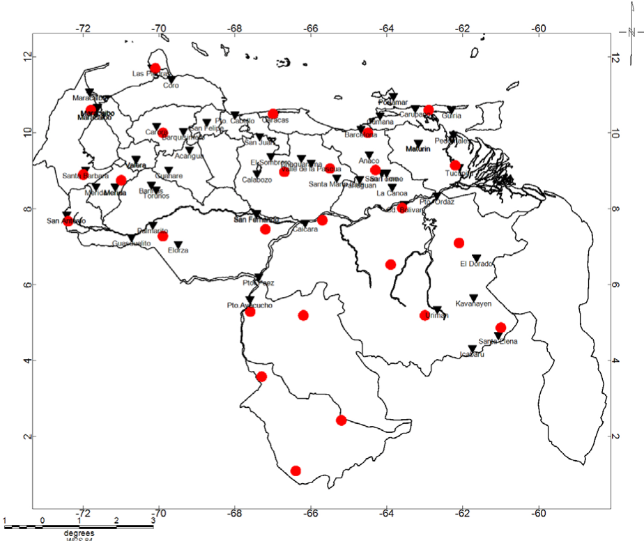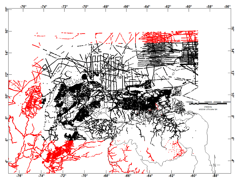 De la publicación de los nuevos valores de gravedad tomados en 1982 y 1988 hasta aproximadamente el año 2012 se tiene una base de datos (en su mayoría común para Universidades e Institutos de Investigación) mezclada de valores de gravedad, unas amarradas al sistema de referencia de la Red Gravimétrica Nacional de Venezuela (RGNV70) y otras amarradas a las estaciones corregidas u homologadas por las medidas realizadas por cartografía nacional y por la Universidad de Hanover (Red de Estandarización Gravimétrica Internacional (IGSN71)). Esto trae como consecuencia anomalías matemáticas o ficticias cuando se trabajan con por lo menos dos o más levantamientos gravimétricos amarrados a diferentes datums. En el trabajo de Graterol 1993 [4] se realiza una homologación o reprocesamiento para la época de unas 140.000 estaciones pertenecientes a la base de datos de la USB para tratar de eliminar este problema. Sin embargo, en un análisis detallado de los levantamientos entre estaciones cercanas se ve que el problema persiste [5]. Para el año 2012 la UCV, ABAE (Agencia Bolivariana Aeroespacial), PDVSA, abordan el problema de tratar de depurar u ordenar la base de datos existente en PDVSA la cual es común a la USB, UCV y Funvisis. La ventana de trabajo fue de 6° a 13° grados de latitud y -73 a -58 grados de longitud esta ventana de revisión se debe a que se tenía como objetivo principal el estudio de las cuencas petroleras del país, la figura 2, se muestran todas las estaciones existentes en la base de datos. Observando los mapas generados a partir de la base de datos existentes, en algunas aéreas salen a relucir anomalías gravimétricas que no tenían una correlación geológica adecuada al contexto donde ésta se ubicaba ya que se notaba un máximo en una zona de alto espesor de sedimentos y estos por lo general son asociados a mínimos gravimétricos. Luego revisando los datos de origen se notó que la estación gravimétrica