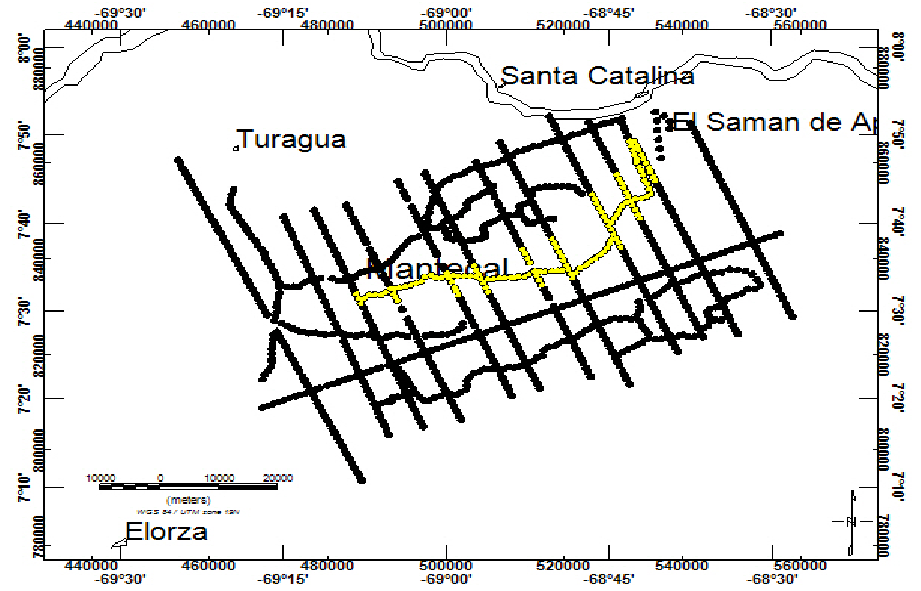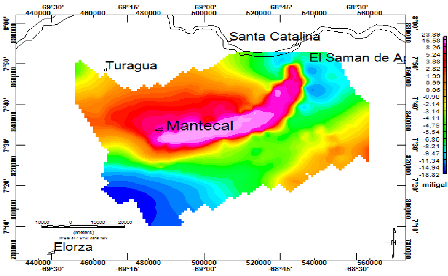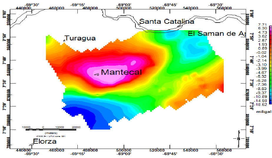 (estación base) a la cual estaban amarrados estos datos poseía el valor en exceso de 14.826 mGal. A continuación se da un ejemplo de una simulación, para ver cómo afecta la integración de datos gravimétricos a diferentes datums la interpretación cualitativa y cuantitativa. Este sería un caso hipotético, donde se tiene el levantamiento realizado por la empresa sísmica Bielovenezolana para el 2010 en la zona circundante al graben de Mantecal, el levantamiento está amarrado al BM (Benchmark, o punto de referencia de medidas de gravedad) de la población de Elorza con valores de gravedad 978066,660 mGal homologado a la red de 1971. La figura 3, muestra el gráfico de las estaciones gravimétricas adquiridas, en color amarillo se tienen varias estaciones que hipotéticamente fueron amarradas a una base con los 14.826 mGal por exceso, o sea que tendremos un levantamiento mezclado. Las figuras 4 y 5, muestran las anomalías de Bouguer para el caso homologado y para el caso contaminado por ruido asociado a el amarre de los 14.826 mGal. Obsérvese como aparece una anomalía positiva al noreste de la población de Mantecal y que llega casi a la población del Saman, esta anomalía es completamente ficticia y no asociada a ningún cuerpo geológico dentro del subsuelo, la variación de mínimo a máximo en valor absoluto para el caso del mapa de la figura 4, es de 26.23 mGal mientras que la variación para el mapa de la figura 5, es de 42.21 mGal. La diferencia entre los dos mapas da 15.98 mGal, este valor es el 61% de 26.23 mGal (valor de variación correcto). En otras palabras al adicionar 14.826 mGal se introduce un error para este caso de más del 60 %, por lo que se concluye que cualquier tipo de interpretación cualitativa o cuantitativa estaría completamente errada. Para el caso del levantamiento Tupure Carora [6] el cual tiene una variación entre máximo y mínimo de 90 mGal, estos 14.8 mGal corresponderían a un error de 16 %. Para el levantamiento Mene de Acosta realizado recientemente con una variación del 71 mGal, el error asociado seria de 22%. Cuando se aplica un filtro matemático con la intención de resaltar algunas características geológicas a los mapas de la anomalía de Bouguer, aparecerá un factor multiplicador de 14.8 que afectan al mapa resultante.