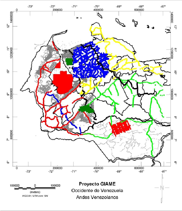 Para el año 2013 - 2014 se realiza el proyecto Geociencia Integral de los Andes de Mérida (GIAME) en el cual se adquieren nuevos datos gravimétricos. Se decide levantar el mayor número de estaciones en tres zonas y perfiles (figura 6,); las bases gravimétricas fueron amarradas a la red 82 [1] normalizada, que está referida a