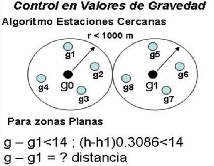 2742 estaciones homologadas a los valores correctos de gravedad. Para el año 2014 se realiza una integración de datos adquiridos para la zona 3 o zona más occidental del proyecto [5]. La integración se realizó solo para la zona 3, la cual cuenta con aproximadamente 40000 estaciones gravimétricas. Para realizar la integración se analizaron dos variables claves para la interpretación como lo son la gravedad observada y la altura de cada una de las estaciones. Se decidió construir un algoritmo (este funciona en las zonas con cambio en la topografía poco abruptos), el cual tiene como valor de gravedad correcto el valor de la estación gravimétrica nueva o estación adquirida para el proyecto GIAME y estudiar los valores de las estaciones cercanas (distancia menor de 1000 m) (Figura 7,). El valor g0 representa el valor de gravedad correcto g1, g2, g3, g4 son los valores de la estaciones viejas a ser estudiadas, si g0-g1 es mayor a 14.8, el factor (h0-h1)0.3086 debe ser mayor a 14.8, si no se cumple esta condición habría que buscar alguna razón geológica que la explique, si no existe se infiere que esta diferencia no se deben a contrastes laterales de densidad sino a que las estaciones están a diferentes datums con lo cual esta estación se clasifica como anómala y es eliminada. Luego se procedió a estudiar la base de datos misma ya que esto solo resultaba para estaciones cercanas a las estaciones adquiridas recientemente. El algoritmo se aplicó estudiando los valores de las estaciones cercanas correctas y viendo en este caso las estaciones vecinas.