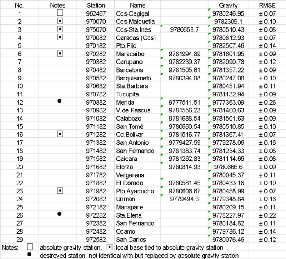 El primer sistema gravimétrico conocido es el Sistema Gravimétrico de Viena establecido en el año 1900; a este sistema le reemplaza el sistema gravimétrico de Potsdam en 1909, este se presenta como un sistema más preciso. Al transcurrir el tiempo se observa que el sistema de Potsdam tiene un error en el orden de 14 mGal [1]. En 1970 la Dirección de Cartografía Nacional de Venezuela asume el levantamiento de una red de referencia de alcance nacional, (Figura 1, tabla1,). La red de referencia de 1970 es identificada con la Red Gravimétrica Nacional de Venezuela (RGNV70), se levantan 58 estaciones. Cuando en el año 1970 en Venezuela se mide la red de referencia, el Sistema de Referencia Gravimétrico Mundial vigente era el de Potsdam, el cual tenía un error del orden de 14 mGal. A nivel mundial, este problema es abordado por la Asociación Geodésica Internacional (AGI), quien deroga el Sistema Gravimétrico de Potsdam en el año 1971 y lo sustituye por la Red de Estandarización Gravimétrica Internacional (IGSN71). En el año 1982 es el Ministerio de Energía y Minas (MEM), junto a la Dirección de Cartografía Nacional, quienes asumen la campaña de campo para levantar una nueva red de referencia, normalizada al IGSN71. En esta nueva red de referencia son levantadas 26 estaciones (Figura 1,) [1]. El año 1988 se desarrolla la primera campaña de mediciones de gravedad absolutas en Venezuela para lo cual se utiliza un sensor de caída de peso, el Jilag-3. Se levantan 6 estaciones absolutas [2]. Producto de las mediciones de gravedad absoluta de 1988 se publica el trabajo de Drewes [3] que además de reportar las gravedades de las seis localidades indicadas incorpora la normalización de las 26 estaciones de la red del 1982 a los nuevos valores absolutos medidos.