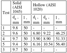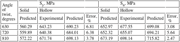 Los ensayos de tracción de las probetas sólidas y huecas, de acuerdo con la norma ASTM E8 / E8M-13a [15], se realizaron para apreciar las variaciones límite de resistencia del material resultantes del proceso de torsión. Finalmente, el rendimiento promedio y la resistencia última se calcularon descartando los valores que estaban considerablemente fuera del rango demarcado por las otras medidas y comparándolos con los predichos por la metodología propuesta.