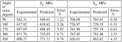 Como se esperaba, el rendimiento axial experimental y previsto y la resistencia última de las barras cilíndricas sólidas deformadas por torsión aumentan con el ángulo de torsión del proceso, como se muestra en la Tabla 3. Esto se debe al endurecimiento superficial del material generado por la cantidad de deformación plástica, es decir, el desarrollo y distribución de deformaciones y tensiones en la pieza de trabajo durante el procesamiento. Por tanto, la deformación equivalente inducida en la muestra es proporcional al ángulo de torsión.
