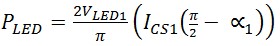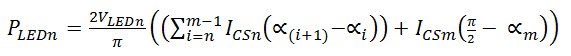 En este circuito, cada etapa de fuente de corriente constante (CSn), conduce entre los ángulos α. y αn+1 hasta llegar a π/2 rad, y circulan por cada led, de acuerdo a la conexión en la figura 2. Para calcular la potencia de cada COB-LED se aplica la ecuación 4:
