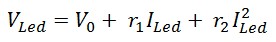 Por ejemplo, para un led Everlight de la serie 62227ET/KK7D, a partir de la curva dada por el fabricante [10] y al hacer la aproximación por el método de mínimos cuadrados, se cumple que: V0 = 2,5729 V. r. = 4,9083 Ω y r. = -10,5891 Ω/A.