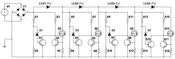 La fuente de alimentación de corrientes pulsantes, propuesta en este trabajo, es mostrada en la figura 2, la cual presenta un circuito de conmutación automática de cuatro etapas. Para empezar el análisis, se considera que los leds representados en el circuito (LED1, LED2, LED3 y LED4) son COB-LEDs o arreglos de leds. En el momento inicial, cuando la tensión de línea es igual a 0 V, los transistores Q1, Q4, Q7 y Q10 están en estado de corte. Luego, la tensión rectificada se eleva, el voltaje entre compuerta y fuente (VGS3) de Q3 se incrementa en la misma proporción, al igual que en los terminales ánodo y cátodo del LED1. La corriente IDS3 de Q3 es nula, hasta que comienza a conducir el LED1; en ese momento empieza a subir la IDS3 y la tensión en R4. Cuando el voltaje en R4 polariza la base de Q2, alrededor de 0,66 V, se reduce la tensión de su colector, que a su vez alimenta la compuerta de Q3 y comienza a detener el incremento de IDS3; en otras palabras, se produce una realimentación de la tensión en esa compuerta hasta conseguir un equilibrio cuando la corriente IDS3 en Q3 es aproximadamente 0,66V.R4, que es el valor de la intensidad de la primera fuente de corriente del grupo y que enciende al LED1. Los valores de intensidad de las otras fuentes de corriente se fijan por medio de las resistencias de fuente Rs .R8, R12, y R16), respectivamente y los voltajes base emisor de Q5, Q8 y Q11. El voltaje base emisor de los transistores bipolares tiene un coeficiente negativo de temperatura, lo cual es útil para reducir las corrientes de las etapas en caso de calentamiento.