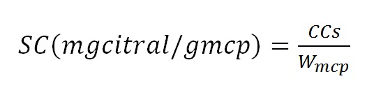 donde CCs es la concentración del citral superficial en el solvente (mg citral en 2 mL de hexano), y es la masa de la micropartícula de citral en (g).