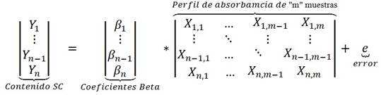 donde Y es la matriz de valores de la variable respuesta, . es la matriz de coeficientes beta, . es la matriz de datos de absorbancia, y X es el error del modelo.