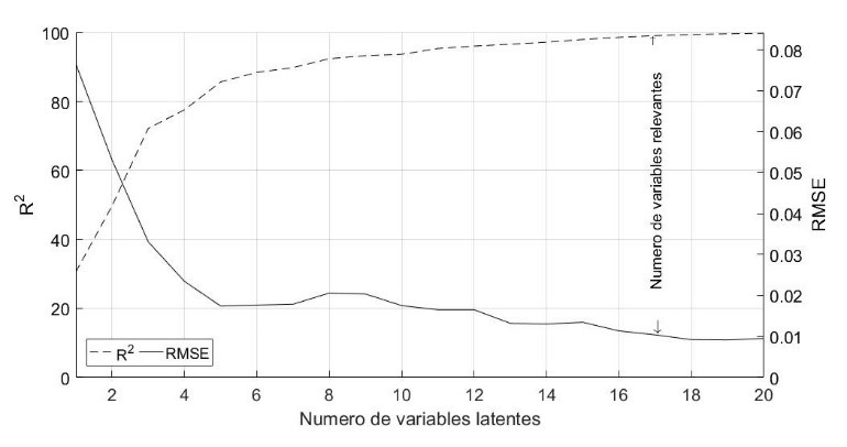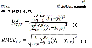 Para la medición de la robustez y predictibilidad de técnicas basadas en análisis multivariados es común el uso del coeficiente de determinación (R2) y el RMSE. Estas medidas pueden ser calculadas usando conjunto de muestras para calibración (modelado), obteniendo R2c; RMSEc; y para validación, obteniendo R2v, RMSEv ; usando las Ecs. (4) y (5) (39).