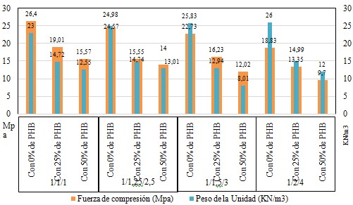 En la Figura 2 se graficaronn los resultados de las fuerzas de compresión que se obtuvieron con los bloquescreados, al reemplazar con 25% de plástico el agregado grueso de piedra con una proporción de 1/1/1. De igual manera, las muestras de concreto con 25% de plástico con proporción de 1/1,25/2,5 y las muestras de concreto con un 25% de plástico a una proporción de 1/1,5/3; mostraron una resistencia de un bloque tipo A. Los bloques tipo A según NTE INEN 0638 [29], se usan en paredes exteriores de carga sin revestimiento y poseen una MPa ≥ 16. A excepción de la muestra con 25% de plástico a una proporción de 1/2/4, la cual exhibió una MPa de 13,35; estando por debajo del índice de 16 MPa.