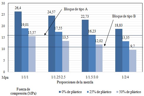 Los resultados de las fuerzas de compresión que se obtuvieron con los bloquesde concreto al reemplazar el 50% de plástico del agregado grueso con una proporción de 1/1/1, 1/1,25/2,5 y las muestras de concreto con proporción de 1/1,5/3; demostraron tener la resistencia de un bloque tipo B. Los bloques tipo B, de acuerdo con NTE INEM0862 [30] se usan en paredes exteriores de carga con revestimiento y en paredes interiores de carga con o sin revestimiento. Estos, mostraron un rango de MPa 16 ≤ MPa ≥ 11, a excepción de la muestra con 50% de plástico a una proporción de 1/2/4, que presentó una MPa de 9,7 la cual se encuentra por debajo del índice de 11 MPa.