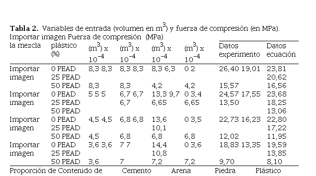 En esa ecuación se mantuvo la resistencia a la compresión de 30 días (f.’ en MPa) como la función del volumen (en m.) de cemento (V.), arena (V.), piedra (VPi) y plástico (VPl). Los valores de las variables de entrada se muestran en la Tabla 2 (como se utilizó en el experimento).