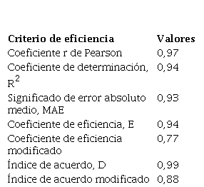Finalmente, entre los criterios de eficiencia se aplicaron el índice del acuerdo (D) y el índice de acuerdo modificado, cuyos valores de 0,99 y 0,88; representando una aportación en la ecuación lineal, básicamente mediante la incorporación de su fórmula de corrección, que excluye la concordancia debida exclusivamente al azar. Esta corrección relacionada las distribuciones marginales de acuerdo con conGeethu and Santhoshkumar [33]. En este sentido, la Ecuación 1 es válida dentro del rango de parámetros aplicables que se muestra en la Tabla 4.