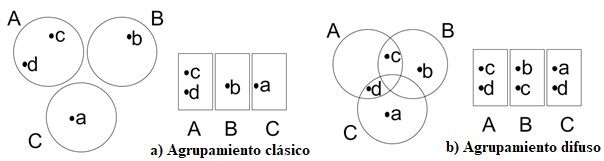 En primer lugar, el ejecutor calcula los grados de pertenencia para los predicados que representan las etiquetas de partición en la agrupación difusa. Para las consultas con agrupación difusa o clásica, los grupos se crean sobre la marcha, con base en las etiquetas especificadas por el usuario. En el archivo nodeAgg.c de PostgreSQL se debe modificar la forma en que el sistema agrupa las tuplas, ya que para cada tupla el resultado se agrupa por el valor de uno o más campos normalmente, es decir, si se agrupa por un campo de edad, entonces hay tuplas que se agrupan por edad = 23, otras por edad = 31, etc. En otras palabras, los grupos son conjuntos disjuntos, en los que no hay elementos que se encuentren en más de un conjunto (Figura 3a). Esta clasificación se realiza mediante una tabla de hash que es entonces extraída para cada grupo, para aplicar los cálculos finales como funciones de agregación. La diferencia en la agrupación difusa es que cada tupla puede pertenecer a uno o más grupos (Figura 3b); esto ocurre cuando se utilizan etiquetas superpuestas (clásicas o difusas) dentro de la partición. Por lo tanto, para los casos de consultas cuantificadas, la función agg_ fill_hash_table verifica si cada tupla del proceso pertenece a alguna etiqueta de cada partición especificada en la consulta. Si la tupla pertenece a más de una etiqueta, se duplica y se introduce en la tabla hash. Si se trata de una partición difusa o hay predicados difusos en la consulta, se calcula su grado de pertenencia y se utiliza para los cálculos de las funciones de agregación count_p y count_ prel. En el caso de esta última, será necesario calcular la cardinalidad de cada etiqueta.