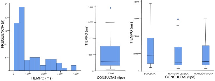 (izquierda). Diagrama de caja para el tiempo de ejecución total (centro). Diagrama de caja por tipo de consulta (derecha).