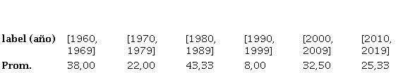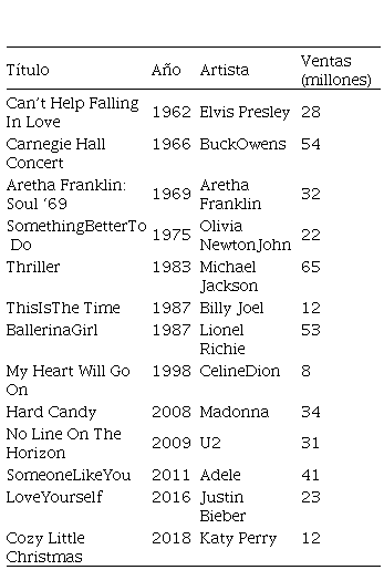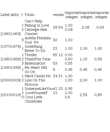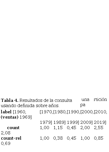 Considere los datos de la cartelera musical mostrada en la Tabla 1, donde un artículo se caracteriza por un título, año, artista y ventas en millones. Además, considere la consulta de un usuario para determinar la media de ventas por década (sesenta, setenta, ochenta, noventa, etc.). En SQL, esta consulta puede expresarse como[8], [11]: SELECT label(año), avg(venta) FROM cartelera GROUP BY label(año) USING p(año) = {[1960, 1969], [1970, 1979], [1980, 1989], [1990, 1999], [2000, 2009], [2010,2019]}; el resultado de esta consulta es presentada en la Tabla 2.