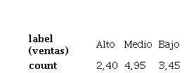 Sobre la base de los datos de la Tabla 1, el resultado de esta consulta se presenta en la Tabla 5. Es decir, para label (ventas) = alto, la cuenta corresponde a la suma del grado de pertenencia de cada tupla que tiene un año mayor que 1990, son: {MyHeartWillGoOn/0, Hard Candy/0.7, No Line On The Horizon/0.55, SomeoneLikeYou/1, LoveYourself/0.15, Cozy Little Christmas/0}, similarlyforlabel(ventas) = medio and label(ventas) = bajo.