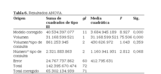 Posteriormente, se realizó un ANOVA para determinar si existía una diferencia significativa entre las medias de la muestra (Tabla 6). Al respecto, se puede decir, con un nivel de significancia del 95% (α= 0,05), que hubo una diferencia al variar el tamaño de la base de datos o el tipo de consultas. Es decir, el volumen de la base de datos y el tipo de consultas, afectan significativamente al tiempo de ejecución de la consulta.