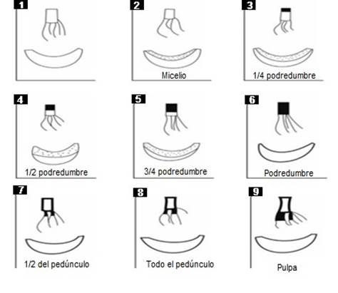 Para la determinación del índice de afectación en la pudrición de la corona del banano se utilizó la escala de Frossard (Cartaya et al., 2011), la escala tiene 9 niveles para la pudrición de corona de banano, siendo el número 1 cuando la fruta está totalmente sana y 9 cuando la pudrición llega hasta la pulpa (Figura 1): según escala de Frossard, basada en la escala de la United Fruit Corporation: 1) sin micelio, 2) presencia de micelio, 3) ¼ de pudrición, 4) ½ pudrición, 5) ¾ pudrición, 6) pudrición, 7) ½ del pedúnculo, 8) todo el pedúnculo, 9) pulpa (Sánchez et al., 2021).