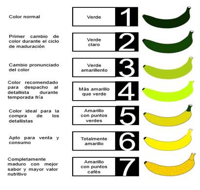 Para la evaluación del grado de maduración en el banano se utilizó la escala de Soto (2008). Se evaluó durante 21 días (tiempo que tarda el fruto de banano en llegar a su destino final), teniendo en cuentan que la coloración del fruto parte desde verde hasta amarillo con pecas oscuras, lo cual significa que alcanzó su etapa de madurez. Esta escala de maduración tiene 7 niveles, el nivel 1 es el fruto color verde; 2: verde claro; 3: verde amarillento; 4: más amarillo que vede; 5: amarillo con puntos verdes; 6: totalmente amarillo y 7: amarillo con puntos café) (Figura 2).