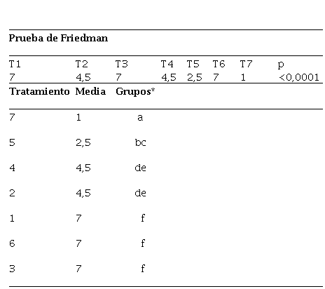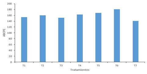 El análisis de varianza indicó que existieron diferencias estadísticamente significantes (p<0,05) de T7 con respecto a los demás tratamientos, presentando un control con valor de 140,90 del área bajo la curva del progreso de la enfermedad (ABCPE), siendo el mejor tratamiento para controlar la pudrición de corona en el fruto de banano, en comparación con los valores intermedios de T3: 151,45; T1: 153,70; T2: 160,15; T4: 162,55 y T5: 168,50, con menor control, siendo estadísticamente inferiores a T6, mostrando la mayor ABCPE, con un valor máximo de 180,80, indicando que no realizó control en la pudrición de la corona en el fruto (Tabla 2 y Figura 3).