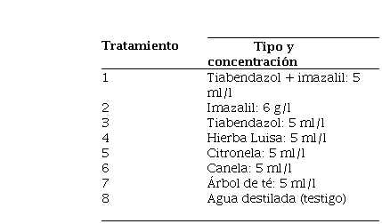 Los aceites esenciales (hierba Luisa, citronela, canela y árbol de té) fueron proporcionados por el Laboratorio de Fitopatología de la Unidad Académica de Ciencias Agropecuarias de la Universidad Técnica de Machala, siendo obtenidos mediante la destilación de hojas y ramas frescas o extracción directa de la corteza del árbol. El tiabendazol e imazalil fueron adquiridos en una distribuidora comercial local, ya que son los que se utilizan en el manejo postcosecha del banano en la región. Para pesar la cantidad a usar de imazalil, se utilizó una balanza electrónica marca KERN, modelo: PCB 350-3, Alemania. Cada preparación se aplicó para cada tratamiento con sus repeticiones (Tabla 1).