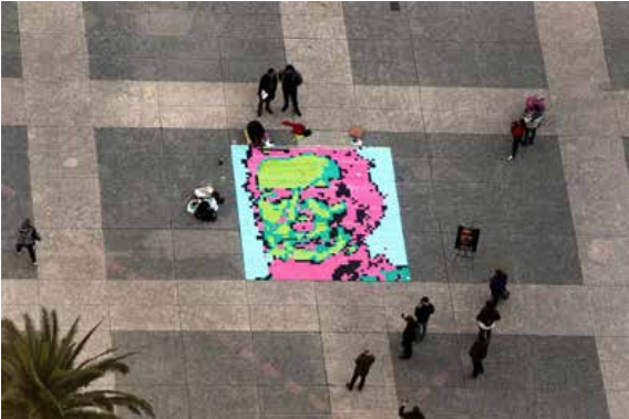 La transposición de la iconografía y de la simbología del héroe en la esfera digital no cambia la dialéctica entre estas necesidades sino la complica. El 29 de junio de 2017 se estrenaba en el cine del Auditorio Nelly Goitiño de Montevideo, Uruguay, el documental “Detrás del Mito”, dirigido por Marcelo Rabuñal, una película cuyo intento principal es precisamente el de problematizar la historia de la creación del retrato arquetípico de Artigas, el de Juan Manuel Blanes. Con motivo del lanzamiento del film, un día después de la conmemoración del natalicio de Artigas, se llevó a cabo también una instalación del artista visual Fernando Corbo, en el piso de la Plaza Independencia (Atme y Andacht 2011). La instalación consistió en crear una versión de gran tamaño del rostro del prócer según la iconografía de Blanes, mediante el uso del “pixel art”. El mural estaba construido a partir de la técnica de mosaico, medía 5 x 6 metros y estaba formado por 4000 papeles de colores.