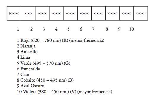 A pesar de que el espectro es continuo y por lo tanto no hay cantidades vacías entre uno y otro color, se puede establecer la siguiente aproximación en base diez: