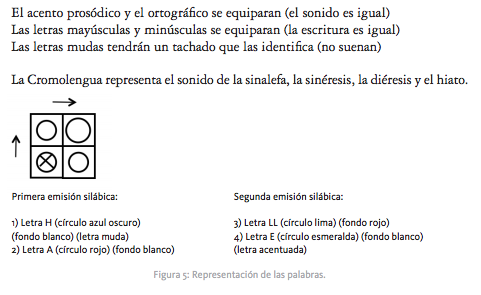 Al sonar lo que se lee se producen sucesiones y simultaneidades de letras y sílabas que no se ven reflejadas en la escritura, y esto atenta contra la claridad y efectividad del código, generando dificultades en el aprendizaje y también rechazo por parte de muchas personas con capacidades diferentes. Esto se debe corregir y la Cromolengua lo hace desde un nuevo diseño de la lengua escrita para que lo que se lea y lo que se emita sea equivalente. La idea es la creación de un solo Multialfabeto para todas las lenguas basado en las matemáticas, donde la imagen de cada letra siga un proceso lógico de desarrollo. Los sonidos de cada lengua pueden ser diferentes, pero sus imágenes se unifican cromáticamente. La letra tiene una forma única (un cuadrado con un círculo en su interior), con variaciones cromáticas y acromáticas. No existe diferencia entre minúsculas y mayúsculas. El tamaño de la letra es variable y se adapta a cada aplicación.