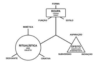 Do mesmo modo, a teoria geral dos signos de Peirce (1995), na sua proposição triádica e classificatória, permitiu uma aproximação rentável aos estudos dos rituais de consumo, com especial atenção ao ritual de uso da moda, garantindo a verificação empírica das diferentes possibilidades cotidianas das roupas: no nível da semelhança (mimética), da singularidade (desviante) e transformação/generalização (criativa).