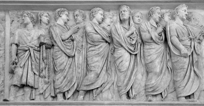 Citando a Virgilio y el destino de los romanos que se manifiesta en la Eneida, el emperador, desde el poder, impone una imagen en la ciudad que, en sentido estricto, puede considerarse una “moda”. Un uso que se difunde como una marca de reconocimiento, no tanto de clase como de ciudadanía, pero, sobre todo, una marca estética, porque Augusto, que se jactaba de haber recibido una Roma de ladrillo y haberla devuelto de mármol, quería que el pueblo de Roma, los ciudadanos, estuvieran a la altura de una ciudad de tamaña belleza y dignidad. De este modo, la toga se convierte en un dress-code que es necesario respetar. Las imágenes que se producen en ese momento, en las que los romanos se ven reflejados, consagran esta vestimenta y, sobre todo, muestran la correcta manera de llevarla, con los plegados adecuados, el umbo y el sinus, los grandes pliegues centrales, bien definidos, como se puede ver en los relieves del Ara Pacis Augustae, el altar que se dedica a la Paz, alcanzada sin precedentes en la época del emperador. En la representación de la ceremonia sacrificial hacia el altar se petrifica un desfile ceremonioso en el que participa toda la familia imperial -mujeres y niños incluidos- ataviados como era conveniente: los ciudadanos varones en toga, las mujeres con palla y stola, los sacerdotes de los distintos colegios con la vestimenta propia de su cargo y condición, y los niños, vestidos de troyanos, una especie de “disfraz” que recordaba el origen de la ciudad.