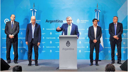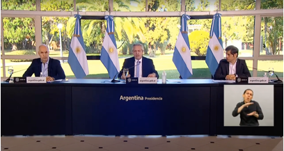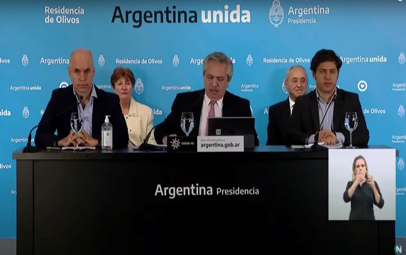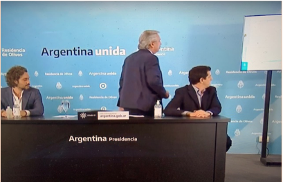 En sus anuncios oficiales del 26 de junio y del 17 de julio, Fernández está sentado, como es común, junto al jefe de gobierno de la Ciudad de Buenos Aires, opositor, y del gobernador de la provincia de Buenos Aires, aliado político. Lo que más se destaca de la puesta en escena mediática es el fondo, vidriado, que permite ver el jardín de la residencia de Olivos, donde viven los presidentes argentinos[6]: