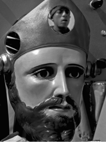 La fotografía de Francisco Mata constituye una densa problematización de la condición dialógica de la mirada que conforma toda fotografía: la máscara regresa al danzante su imagen a través del espejo y con ello puede ver su mirada reflejada al mirar la máscara. El que mira es mirado. Pero la mirada de la máscara es simultáneamente una mirada congelada y una mirada viva, activada. La mirada fija reposa en los ojos pintados de la máscara, con la irreductible icónica de una tradición que parece extenderse desde las danzas de conquista, en las que se elabora simbólicamente la relación, el conflicto entre conquistados y conquistadores. La mirada vida se disloca en dos partes: en la mirada de quien se ve en el espejo que la máscara lleva en su corona, y en la mirada que se esconde atrás de los agujeros invisibles de los ojos de la máscara. Es posible mirar esta foto no solo como un decir sobre la relación de miradas en la tradición lúdica y simbólica desde la conquista, y en su reactualización urbana contemporánea; sino también como una hermenéutica de la propia fotografía. Visto así, esta fotografía elabora las relaciones de mirada propias de la condición de toda fotografía: La mirada fija de la máscara es aquí una metáfora de la textualización de la mirada del fotógrafo en la fotografía. El proceso en que la mirada empírica e histórica del fotógrafo se vuelve texto fotográfico, y su camino de regreso. Su mirada viva se encuentra simbolizada en la mirada del danzante que ve, borrosamente su rostro en el espejo. Borrosa porque esa mirada cárnica, animada, concreta, ya está desdibujándose en la fotografía, pasa de su condición activa y encarnada a su condición textual, fotográfica. Es entonces el tránsito temporal y semiótico (icónico) de la mirada-viva-especular; a la mirada fija-máscara. En el tramo que va del espejo en la corona a los ojos pintados de la máscara, está la transfiguración de la mirada-carne del fotógrafo, a la mirada-texto en la fotografía. Pero también está indicado aquí el camino de regreso: porque nuestros ojos que oscilan entre el rostro en el espejo y los ojos de la máscara, están en la expectativa de una mirada que atrás de esos ojos pueda vernos, como atravesándolo todo. Esa fuerza mítica de la mirada viva de la máscara, es el movimiento que saca la foto de su artificio de mirada (de la pura representación de la mirada) y la lleva a la re-vivificación de la mirada del fotógrafo en nuestra propia mirada. Una densidad adicional: la danza de conquista encara la tensión entre conquistados y conquistadores, decíamos, pero el espejo muestra que probablemente el danzante que se pondrá la máscara no es otro que el que ante ella danza. La arquetipación del rostro español que se figura en la máscara de lo que presumiblemente es uno de los elementos rituales de la danza de los santiagueros, su lisa blancura, su barba rubia y sus ojos nazarenos, tiene un reverso, un rostro otro que lo habita: el rostro mestizo que oculta y que siempre, en todo ritual, le subyacerá.