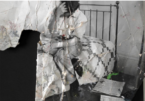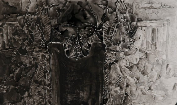 Bacon no usó la fotografía de Freud para pintar ninguno de los numerosos retratos que le hiciera, más bien fue la fuente para un estudio de 1964 en el que se fusiona con él en un autorretrato. En “Regrets” Jhons elabora una memoria compleja y triangulada que lucha por pervivir en el límite de la desaparición: porque la pasión amorosa que Bacon muestra con el autorretrato de su fusión con Freud, espejea en los “Lamentos” de Jhons la relación que él mismo viviera con Robert Rauschenberg en la década de los cincuenta. La apropiación de esta fotografía es un nudo de interpretación y sentido que da cuenta no solo de las pruebas y experimentaciones con diversos materiales y técnicas, sino especialmente una compleja meditación sobre la memoria y la muerte, ahora que han fallecido todos y que figura aquí como ese cráneo enigmático que mira de frente y abre una zanja que devora y redefine todo recuerdo. La foto-memoria, repetida y a la vez devorada por la muerte.